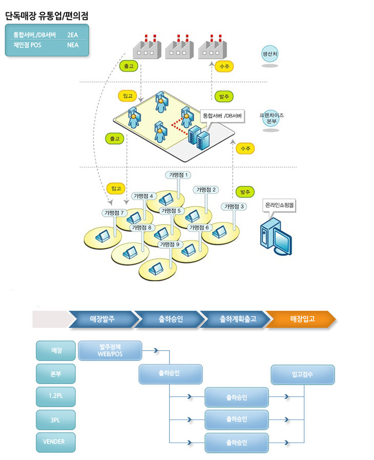 - 가맹점관리 : 가맹점등록, 발주관리, 출고배분, 반품관리, 매출조회등 가맹점관리 업무